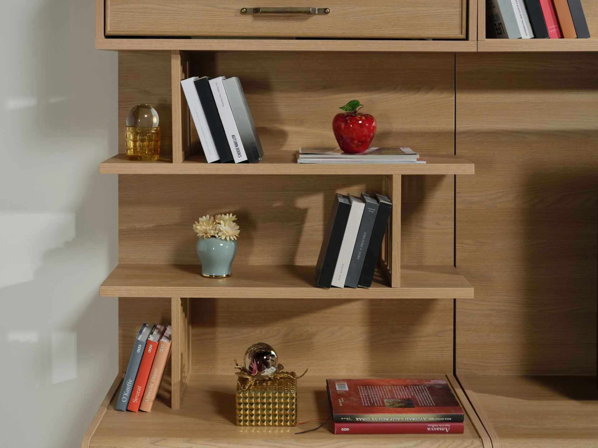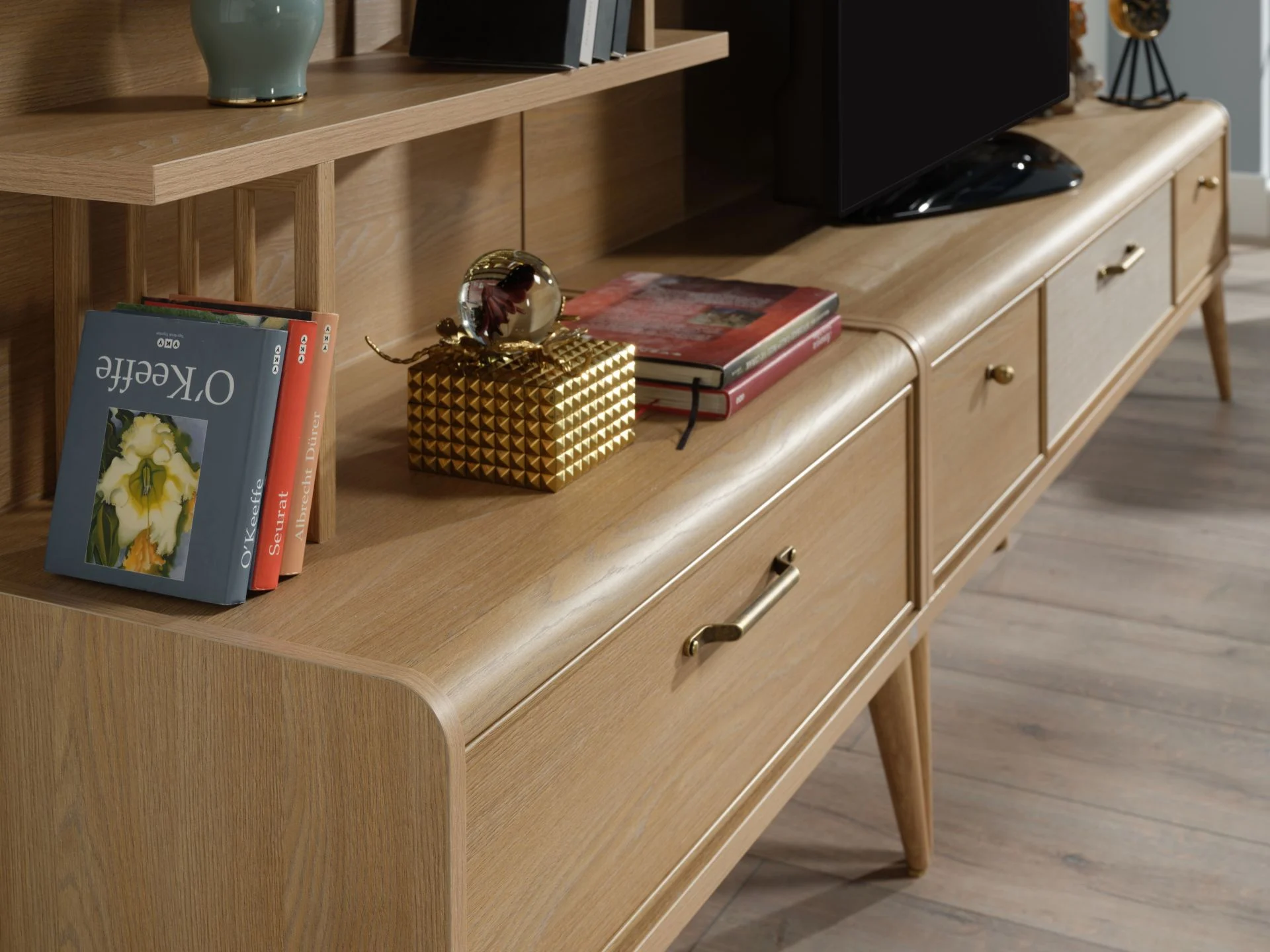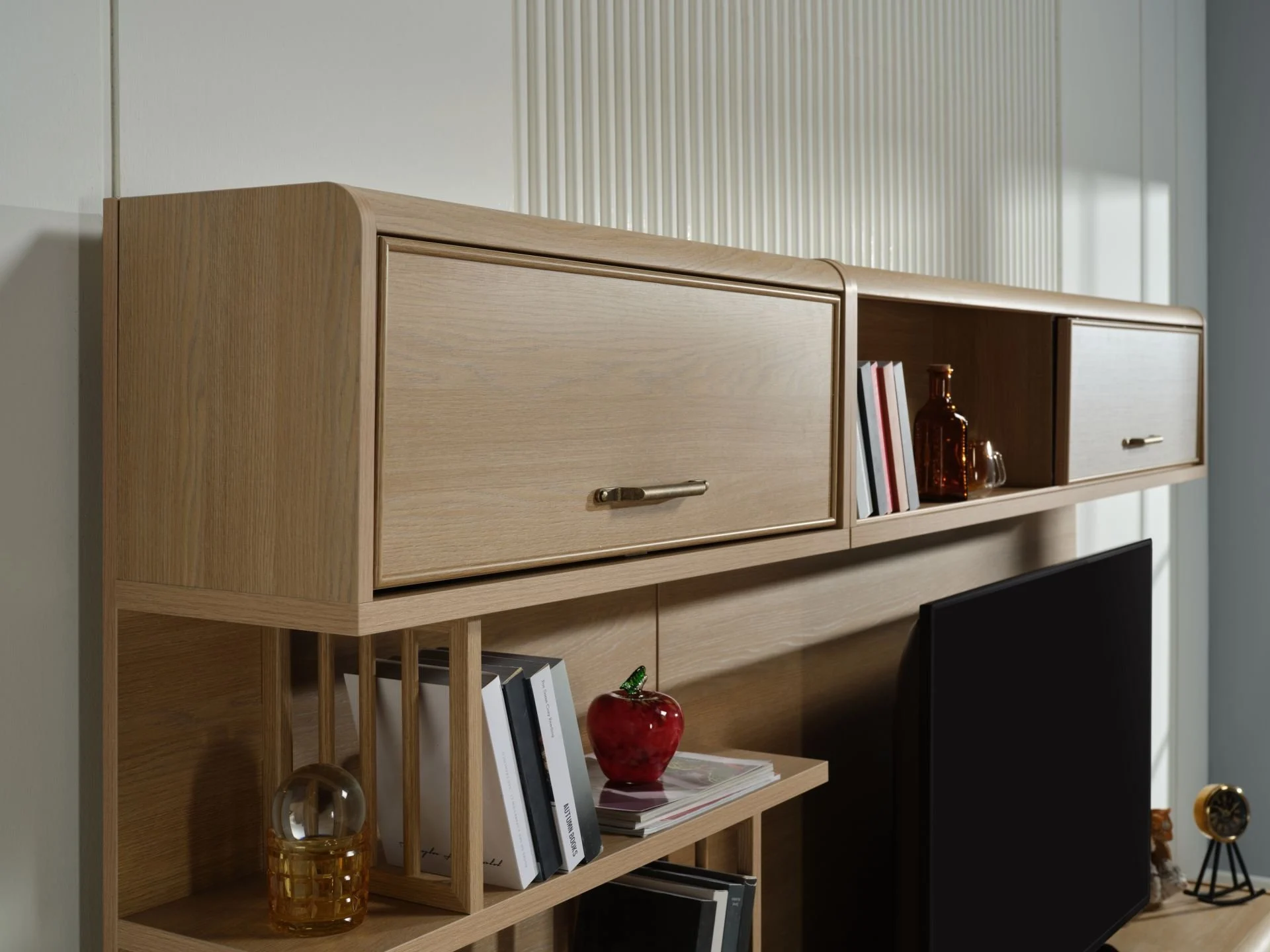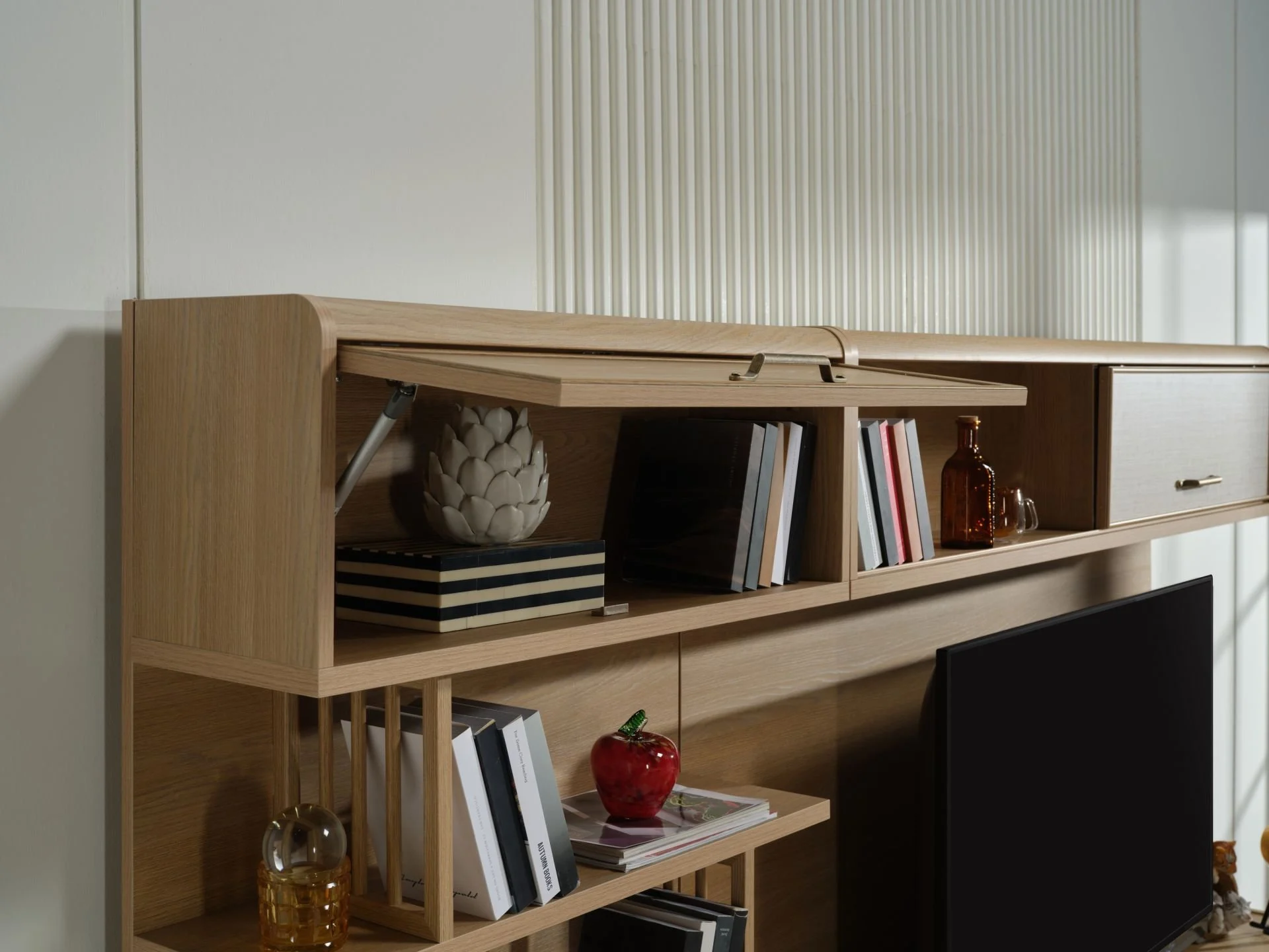 Ansamblu tv cu sertare si rafturi din placi aglomerate din lemn cu furnir si elemente din lemn masiv, HDF.