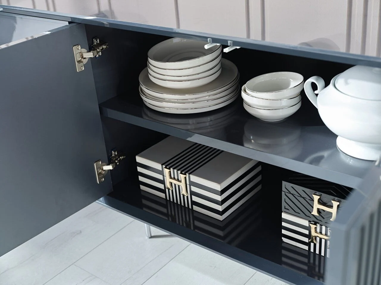 Gama de mobilier Viola impresionează prin intermediul unui design modern, piesele sale fiind realizate într-o cromatică versatilă. Bufetul asigură un spațiu pentru depozitare organizat . Totodată, acesta oferă și un aspect elegant și plăcut în spațiul vostru.Bufetul vă oferă un spațiu generos pentru depozitarea pieselor de vesela, esențial pentru o zona de dining bine organizată si deasemenea un sertar pentru ordonarea tacamurilor.Usile sunt echipate cu sistem de inchidere soft-closing.