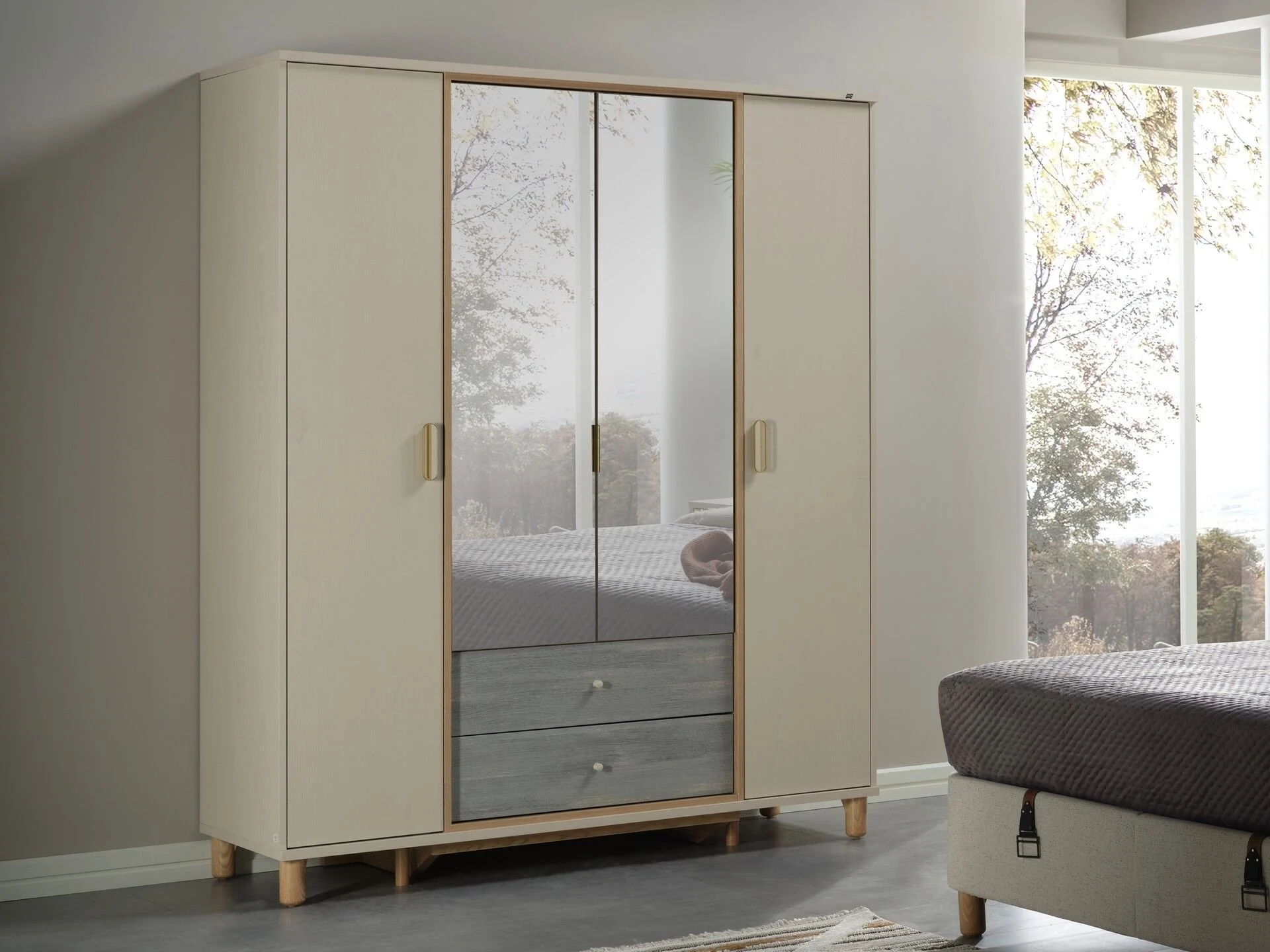 - Tehnologie Silențioasă: Fiecare dintre cele 4 uși este dotată cu balamale cu amortizare (soft-close). Această tehnologie asigură o închidere lină, protejând structura dulapului și păstrând liniștea deplină în dormitor.