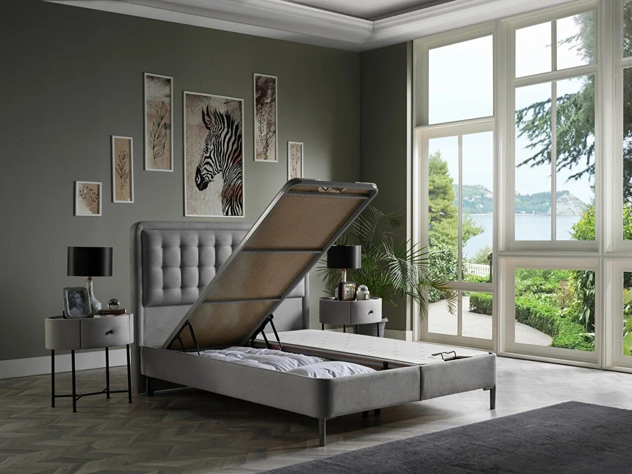 Patul este prevazut cu lada pentru depozitare.Sistemul este caracterizat de structura solida din fier perimetral care leaga tablia de partile laterale, facand astfel compartimentul extrem de solid. Panourile inferioare sunt realizate din HDF, pentru a asigura durabilitatea bazei patului. Somiera este realizata din mdf si sistem clasic de deschidere cu arcuri de gaz.