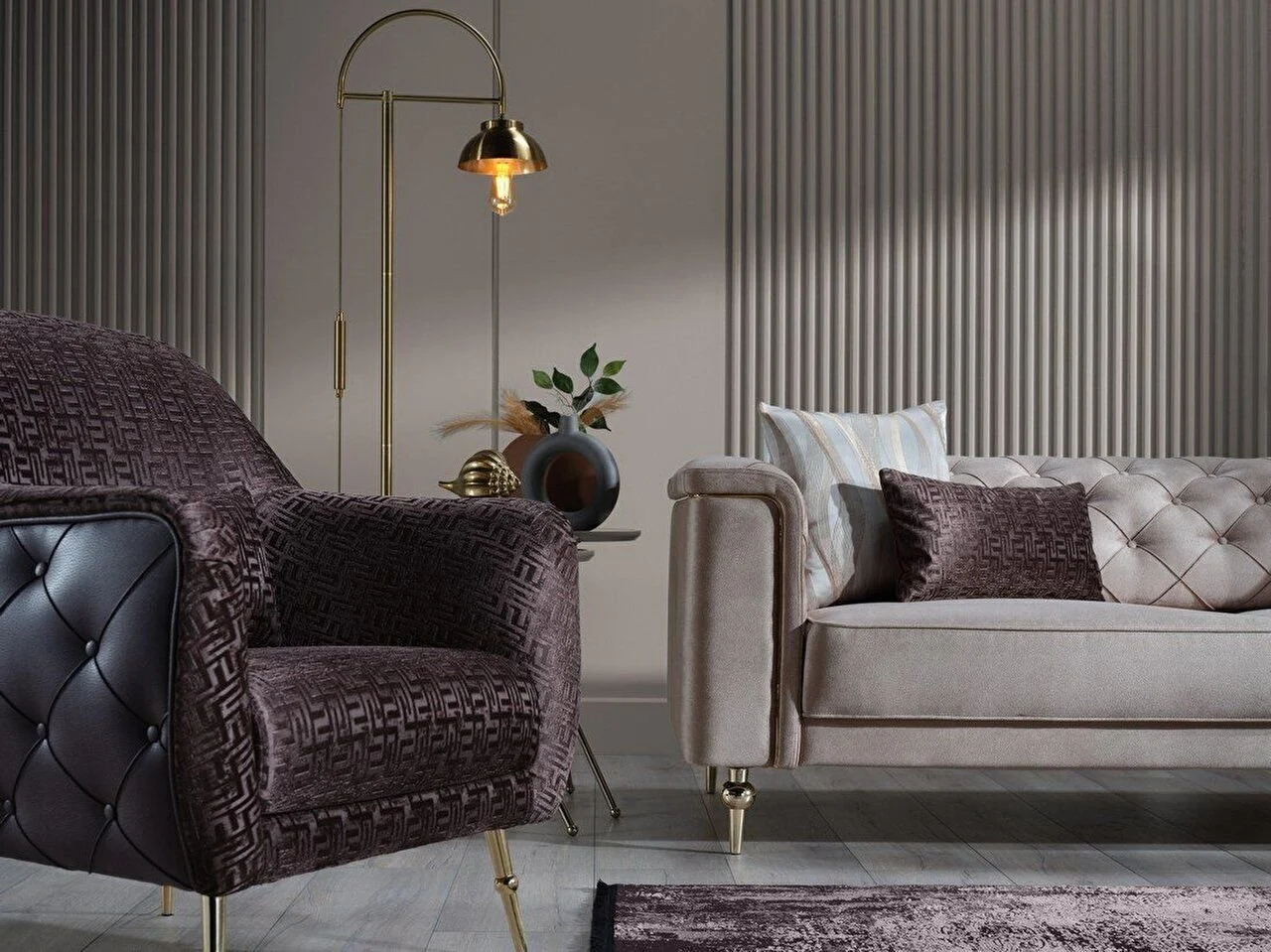 - Detalii Luxoase: Setul se remarcă prin liniile sale curate, completate de accente metalice rafinate la nivelul picioarelor, disponibile în variante de aur (Gold) sau crom (Chrome).