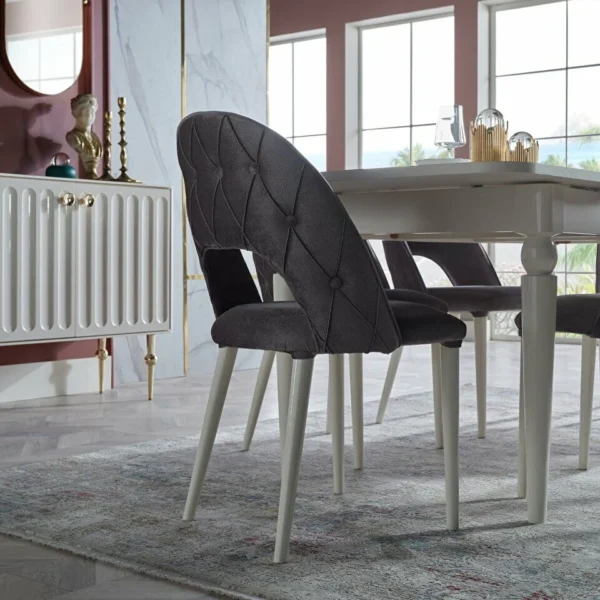 De la consolă la oglinda consolă, de la scaune la otoman, setul de sufragerie, cu fiecare piesă realizată cu atenție, adaugă suflet caselor prin designul său modern. Setul de sufragerie, care constituie o parte importantă a procesului de decorare, poate fi preferat în armonie cu mobilierul precum seturile de sufragerie și grupurile de scaune, sau poate fi preferat în design propriu. Cu designul său simplu, culoarea gri și detaliile interesante, setul de sufragerie adaugă o atmosferă diferită zonelor tale de luat masa. Acest set de sufragerie, care este unul dintre cele mai preferate seturi din catalogul de modele de sufragerie, pune in evidenta decorul prin eleganta sa.